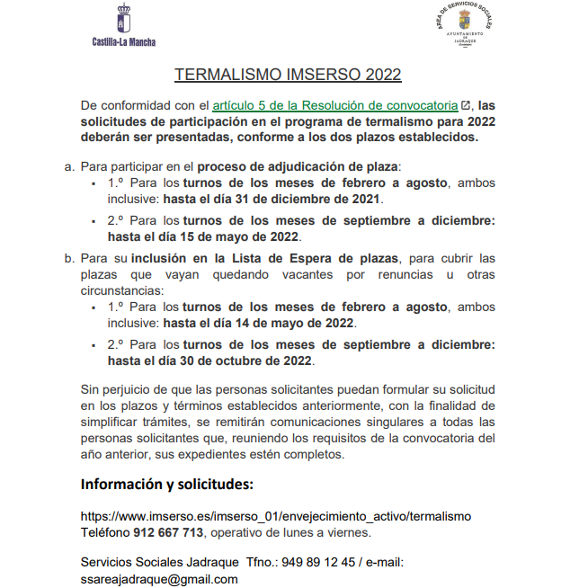 Desde el Área de Servicios Sociales de Jadraque nos envían para su difusión, información para el programa de Termalismo del IMSERSO de 2022.