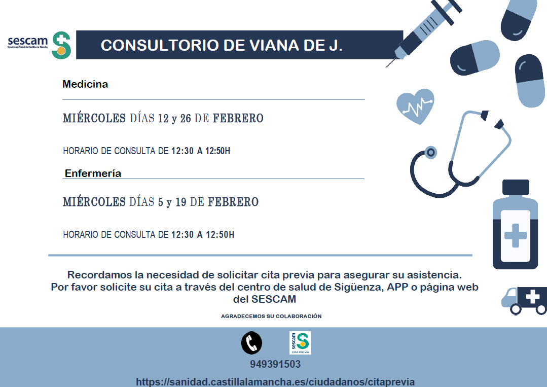 Según nos informan desde el Área Básica de Salud de Sigüenza, las citas en el mes de febrero en el Consultorio Local de Viana de Jadraque están previstas los días: