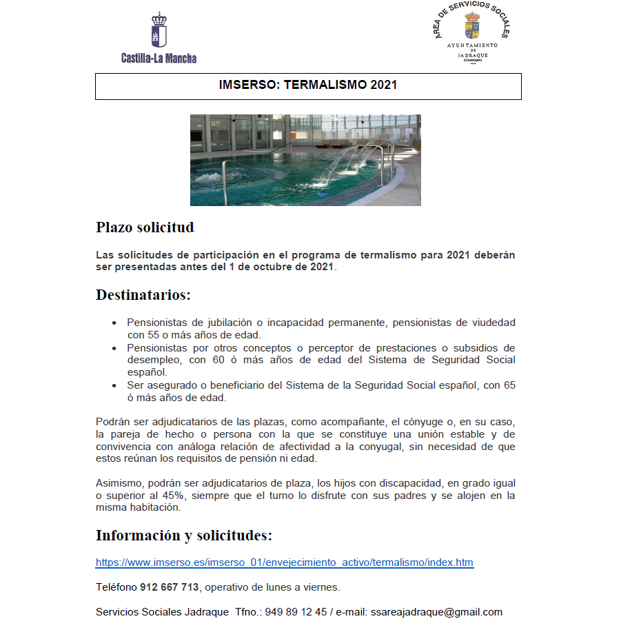 Desde el Área de Servicios Sociales de Jadraque solicitan que se divulgue el cartel informativo del programa de Termalismo 2021 del IMSERSO.