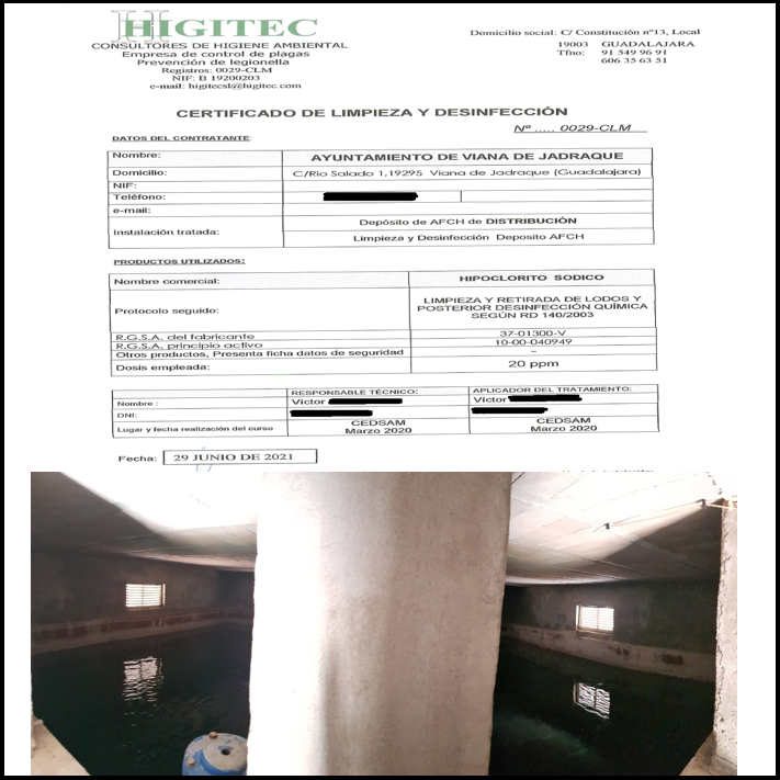 En relación con la aplicación del Real Decreto 140/2003, de 7 de febrero, por el que se establecen los criterios sanitarios de calidad del agua de consumo humano, el pasado 30/06/2021 la empresa Higitec procedió, por encargo de este Ayuntamiento, a la limpieza y desinfección del Depósito Municipal de Agua Potable de Viana de Jadraque con la finalidad de seguir actualizando y cumpliendo con el Protocolo de Abastecimiento de Agua de Consumo Humano según requiere la Delegación Provincial de Sanidad de Guadalajara de la Junta de Comunidades de Castilla-la Mancha.
