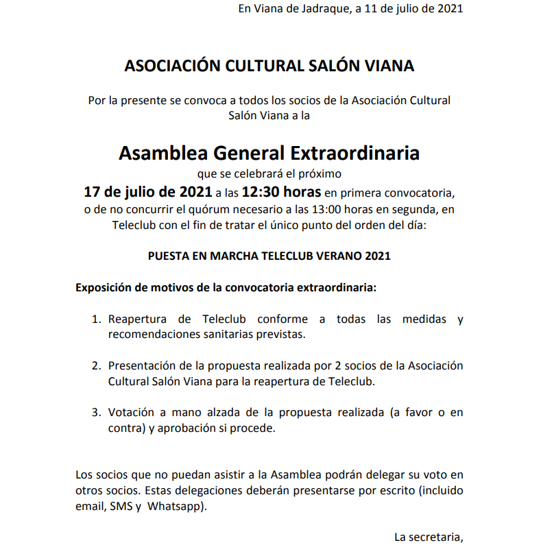 La Asociación Cultural Salón Viana convoca a Asamblea General Extraordinaria a sus socios el próximo sábado 17/07/2021 en el Centro Social del Ayuntamiento de Viana de Jadraque a las 12:30 horas en primera convocatoria, y a las 13:00 horas en segunda, para tratar la puesta en marcha del Tele-Club.