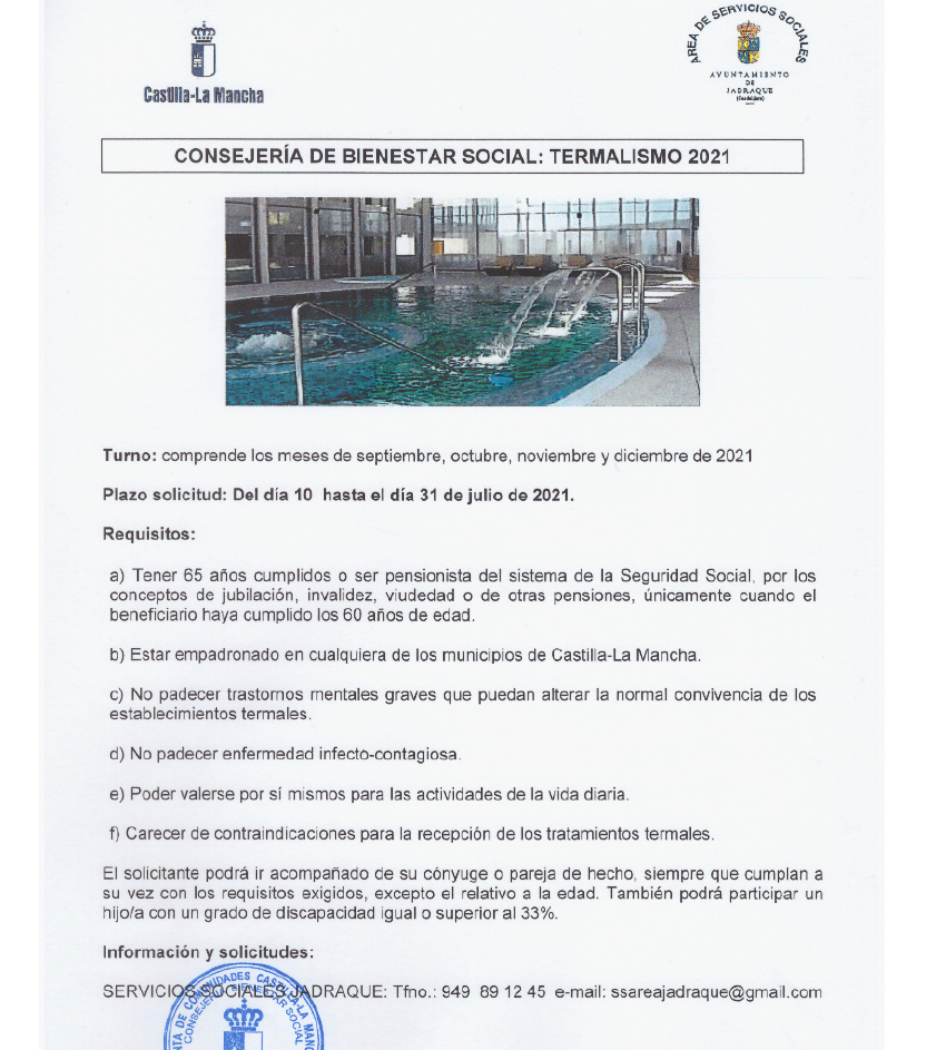 Desde el Área de Servicios Sociales de Jadraque nos remiten información sobre los Programas de Termalismo para el año 2021, que comprenden los meses de octubre, noviembre y diciembre de 2021.
