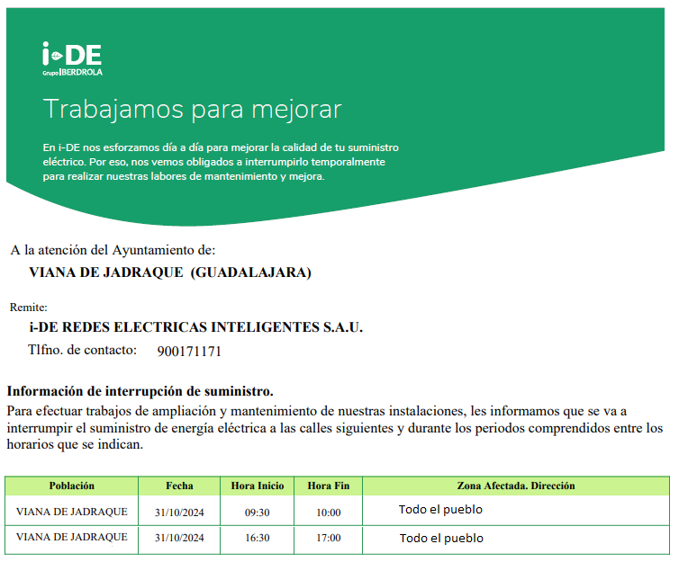 I-DE REDES ELÉCTRICAS INTELIGENTES, S.A.U., empresa encargada de la red eléctrica de Iberdrola, informa al Ayuntamiento de Viana de Jadraque de que el próximo día 31 de octubre, con el fin de efectuar trabajos de ampliación y mantenimiento de sus instalaciones, van a interrumpir el suministro de energía eléctrica en el pueblo, en los siguientes tramos: