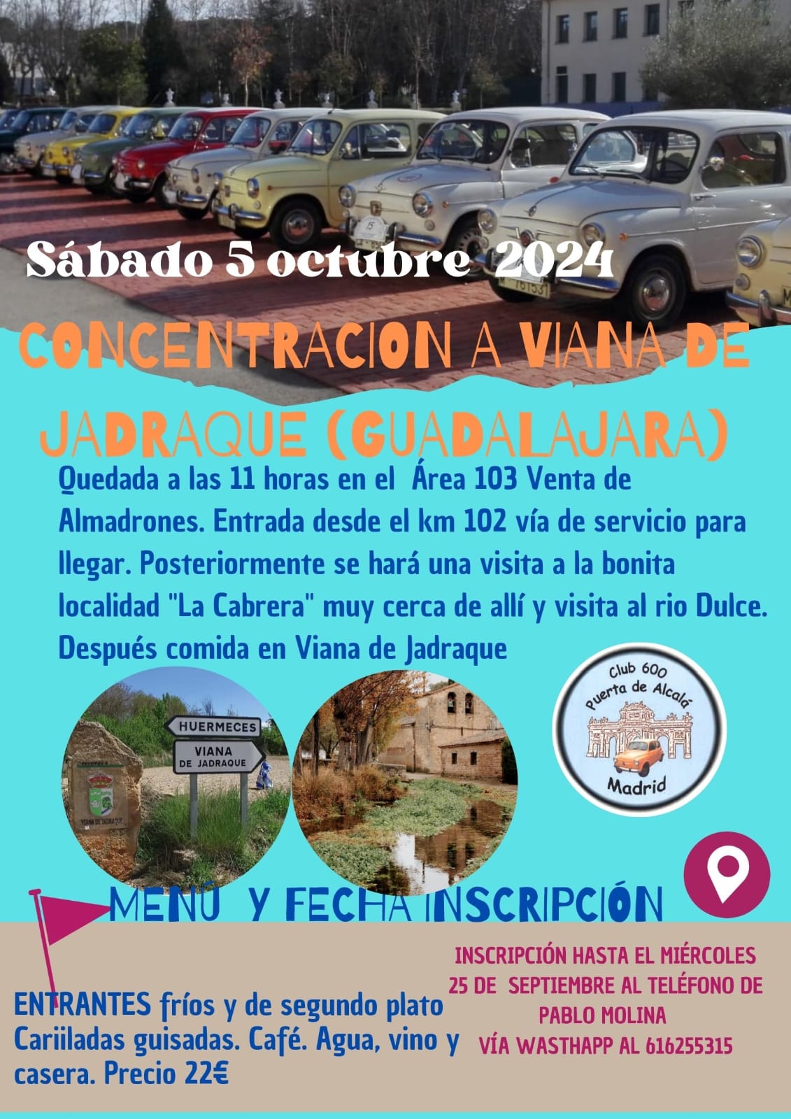 El Club 600 Puerta de Alcalá de Madrid nos informa que el próximo día sábado 5 de octubre vuelve a Viana de Jadraque a realizar una concentración de vehículos SEAT 600.