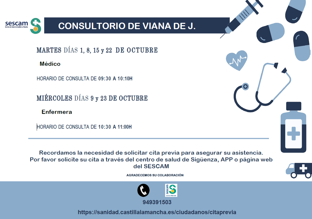Según nos informan desde el Área Básica de Salud de Sigüenza, las citas en el mes de octubre en el Consultorio Local de Viana de Jadraque están previstas los días: