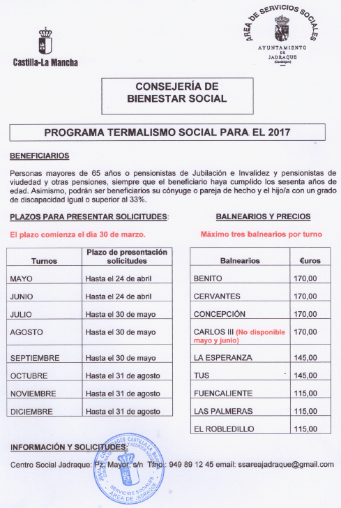 Desde el Área de Servicios Sociales de Jadraque nos piden difusión del Programa de Termalismo Social para el año 2017. Exponemos en el Tablón de Anuncios del Ayuntamiento y en este Portal Web.