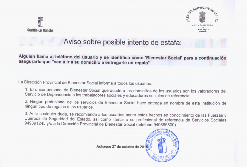 Ya no solo podemos ser timados por revisiones de gas sino que también haciéndose pasar por instituciones públicas. La estafa consiste en una llamada telefónica identificándose como personal de Bienestar Social, informándoles que van a ir a su domicilio a entregar un regalo. Lo difundimos para ver si es posible que todo el mundo esté enterado y nadie sufra la estafa.