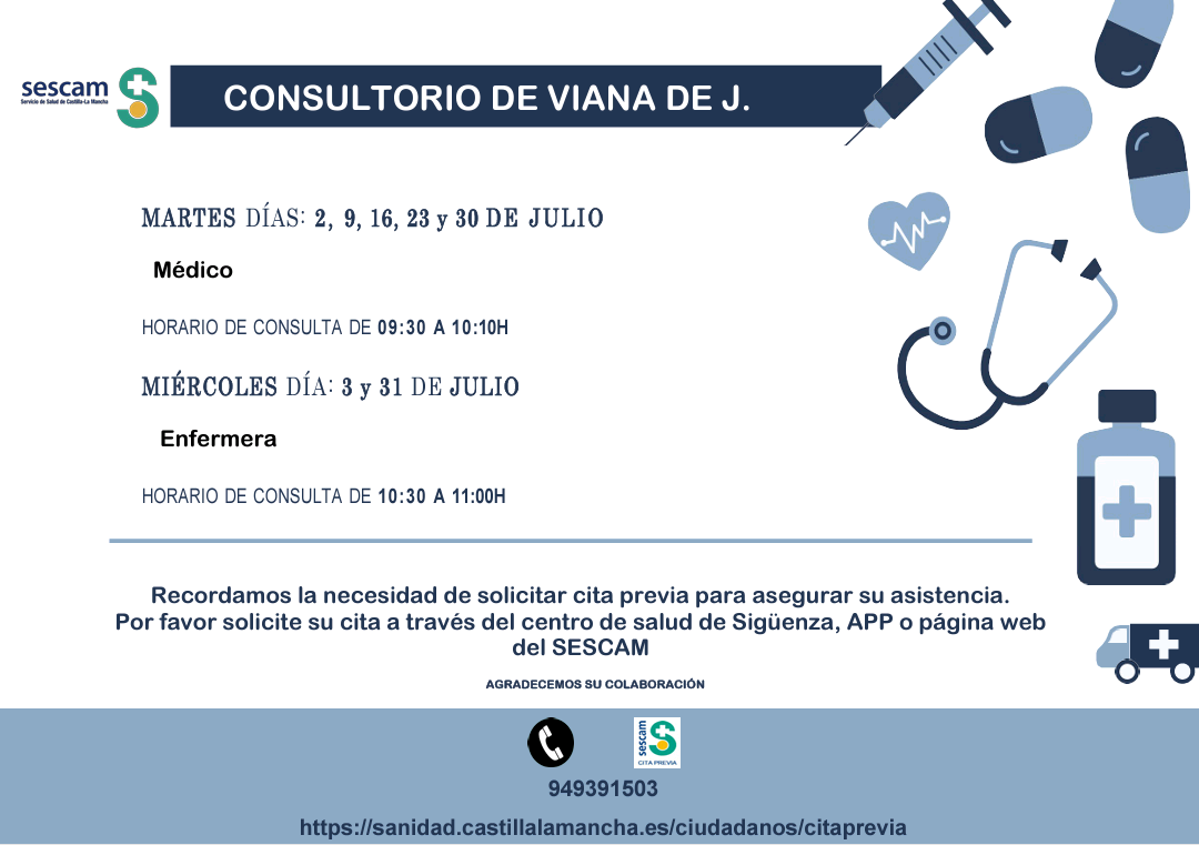 Según nos informan desde el Área Básica de Salud de Sigüenza, las citas en el mes de agosto en el Consultorio Local de Viana de Jadraque están previstas los días: